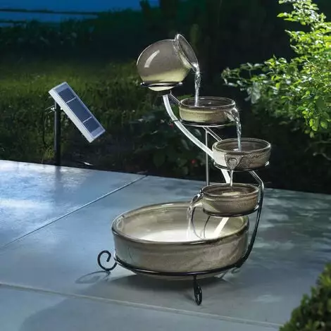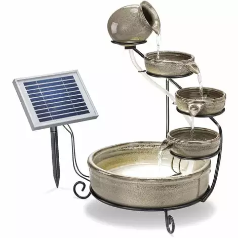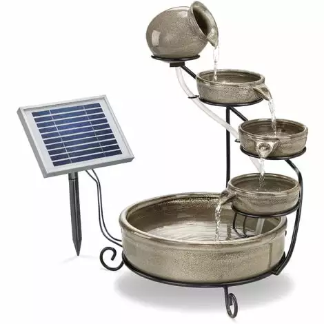 Le cadre en métal robuste assure un support sûr, tandis que les bols en céramique galbés individuels incarnent le style méditerranéen typique. Grâce à une pompe solaire efficace pour bassin, le soleil assure seul le fonctionnement, tandis que la batterie de stockage intégrée compense les phases de nuages et permet un fonctionnement de nuit.