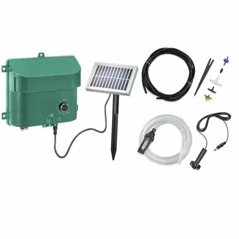 Kit d’arrosage solaire Esotec avec batterie, panneau, pompe, tuyau, buses, etc.