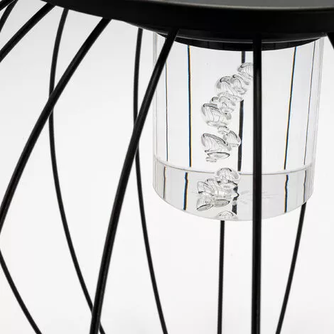 Au milieu des tiges métalliques se trouve une lampe en verre acrylique massive avec des bulles dair fermées, qui scintillent comme par magie au soleil pendant la journée. La lumière solaire ne montre sa vraie beauté quaprès le crépuscule – la lumière blanche agréablement chaude illumine le corps lumineux de lintérieur et évoque un jeu de lumière fascinant sur son environnement.