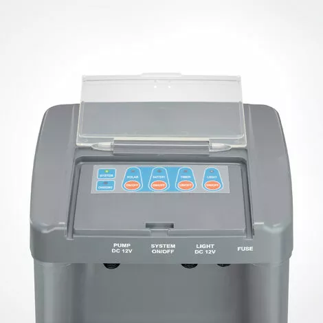 - Minuteur : AprĂšs avoir appuyĂ© sur le bouton de la minuterie, la pompe fonctionne pendant 4 heures. La pompe sÂarrĂȘte ensuite. AprĂšs 20 heures, la pompe recommence Ă fonctionner au mĂȘme moment pendant 4 heures. Pendant la pĂ©riode de repos, la batterie est chargĂ©e via le module solaire lorsque le soleil brille.