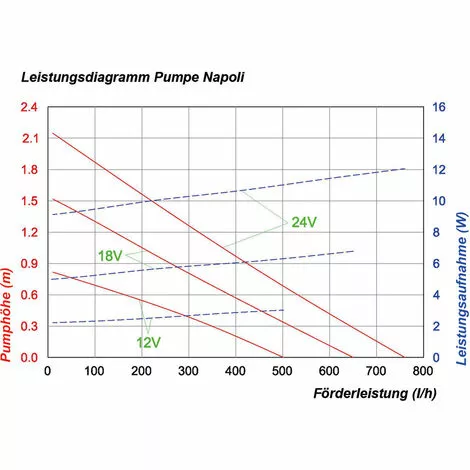 - Hauteur de refoulement à 12 V : max. 0,8 m, à 24 V : max. 2 m