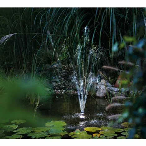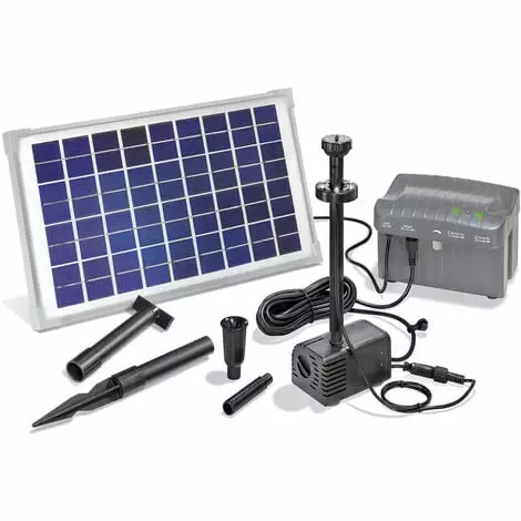 Le système de pompe peut être utilisé dans un étang ou pour fournir de leau à une pierre source. Le module solaire génère suffisamment dénergie en plein soleil en été pour faire fonctionner la pompe avec de la lumière et pour charger la batterie en même temps. La tension et donc la puissance de la pompe peuvent être régulées entre 12 et 24 V via un contrôleur intégré dans le boîtier de batterie. Pompe fermée sans balais de haute qualité avec protection contre la marche à sec et éclairage LED longue durée. Différents modèles de pulvérisation peuvent être créés avec les 4 tuyaux montants et 2 arroseurs différents (arroseur à 3 étages et cloche à eau) inclus.