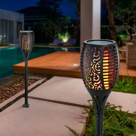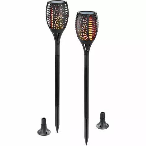 Ces torches solaires imitent une flamme réaliste, générée par 96 LED jaunes / orange. Grâce au fonctionnement solaire sans fil, vous navez besoin que dun endroit ensoleillé pour le positionnement ! Vous pouvez la placer en toute sécurité entre des buissons dans le sol ou la fixer à un mur à laide de la plaque de montage fournie.